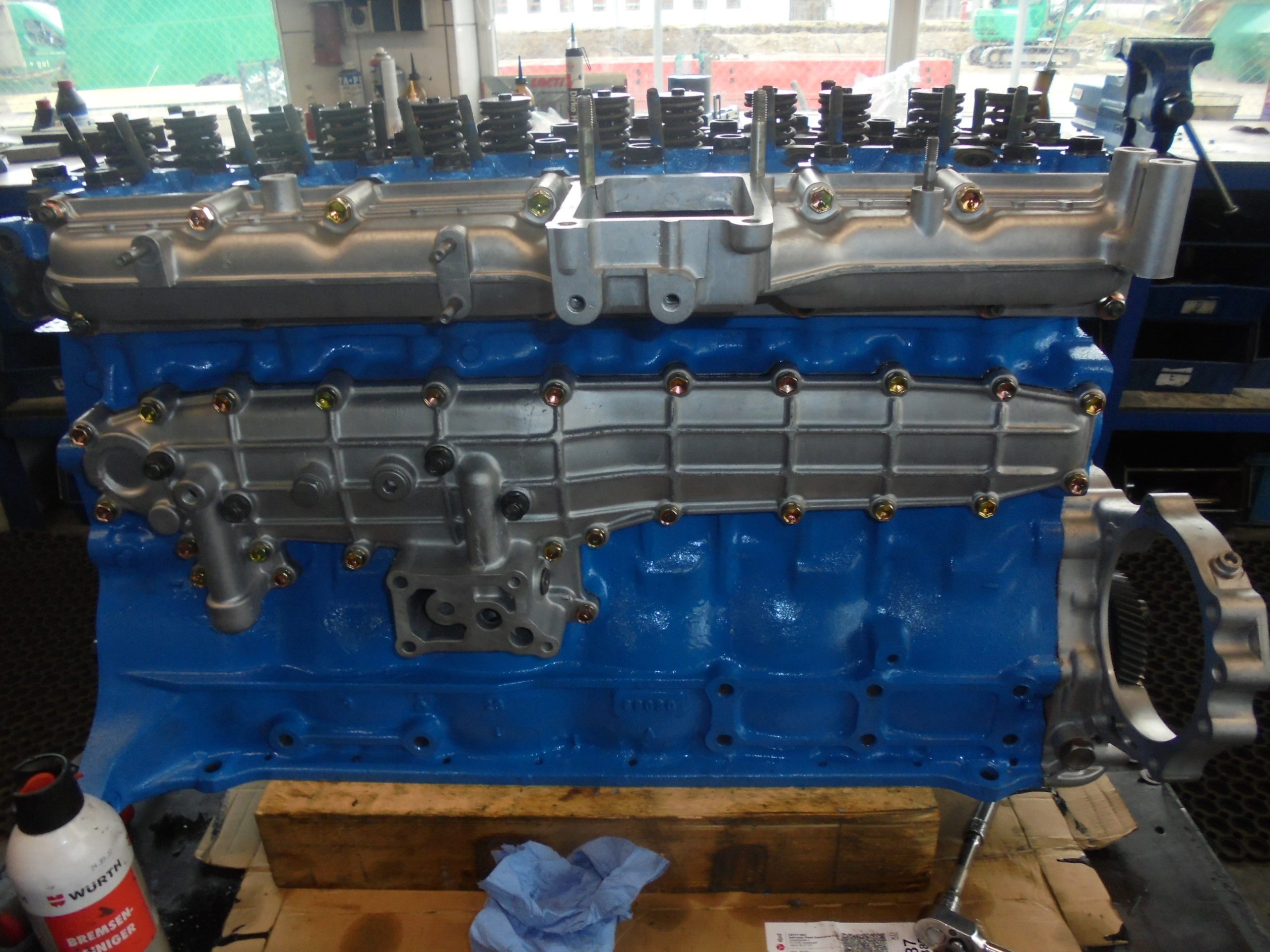 Dichtheitsdruckprüfung am Motorblock durchgeführt. Kühlkanal vom Motorblock im Säurebad entkalkt und Kühlkanäle gespült. Kernlochdeckel von Motorblock ausgebaut, Bohrungen gereinigt und neue Kernlochdeckel eingebaut. Nockenwellenlagerbuchsen von Motorblock ausgebaut, Grundbohrungen für Lagerbuchsen vermessen. Neue Lagerbuchsen eingebaut und vermessen.